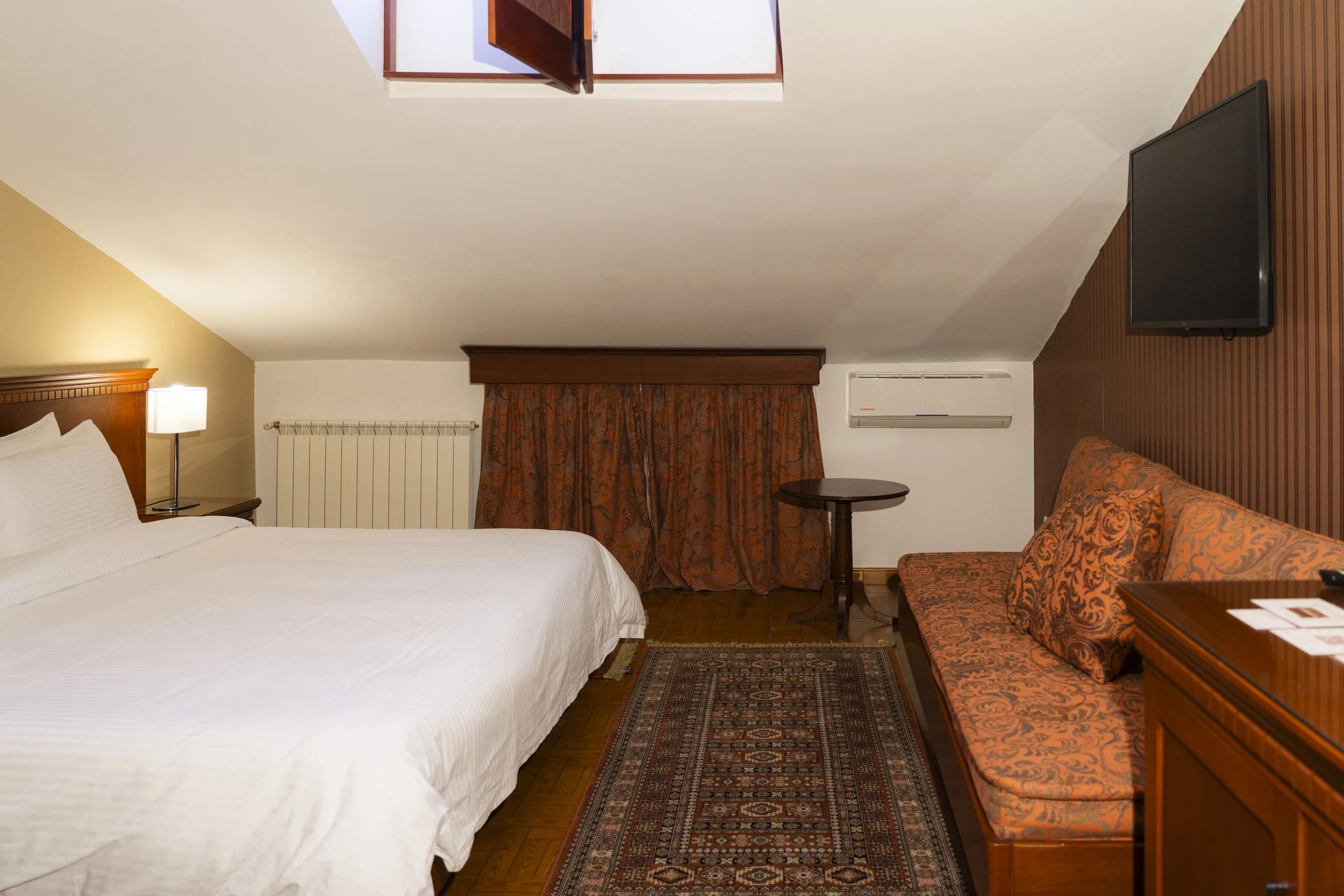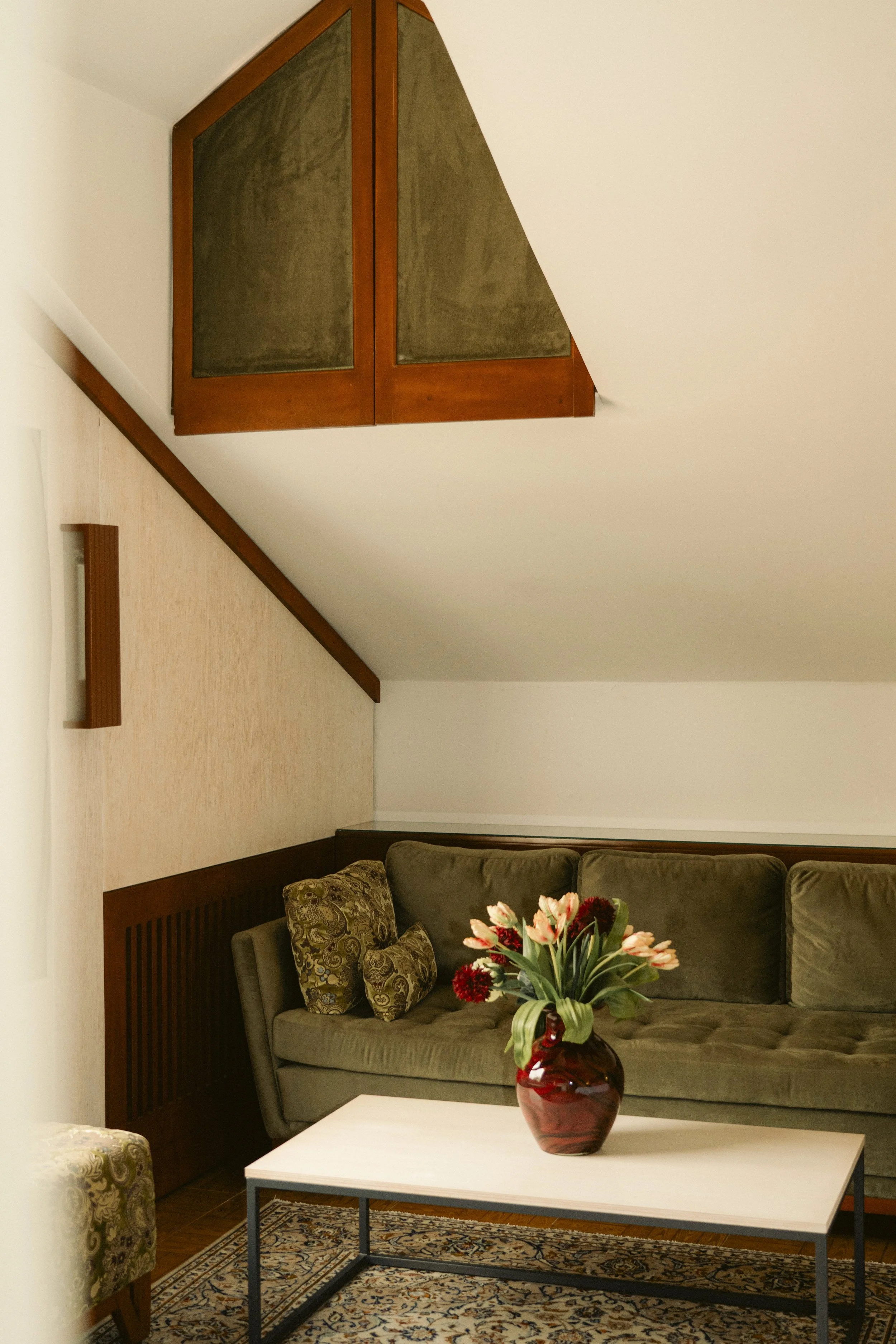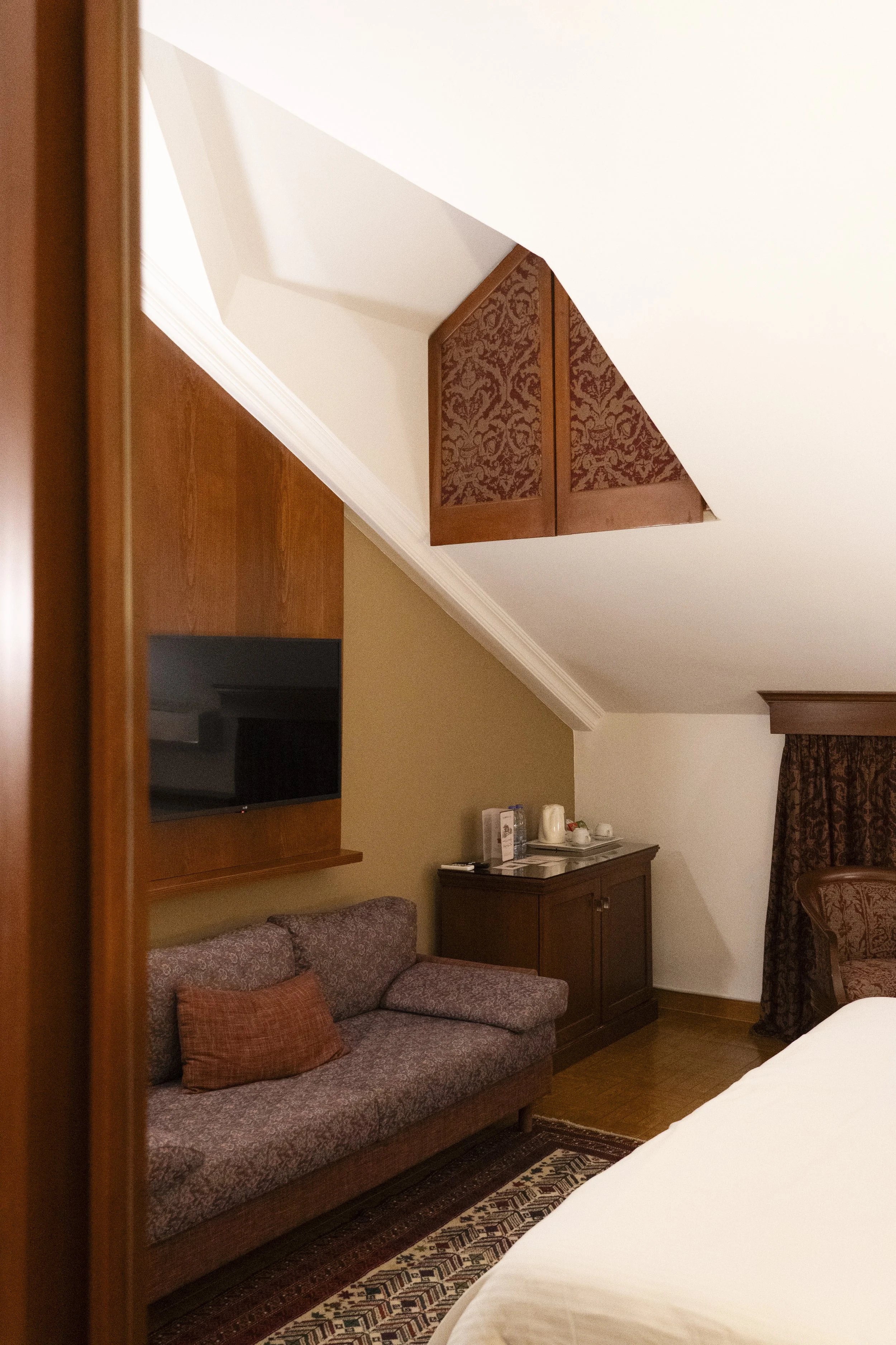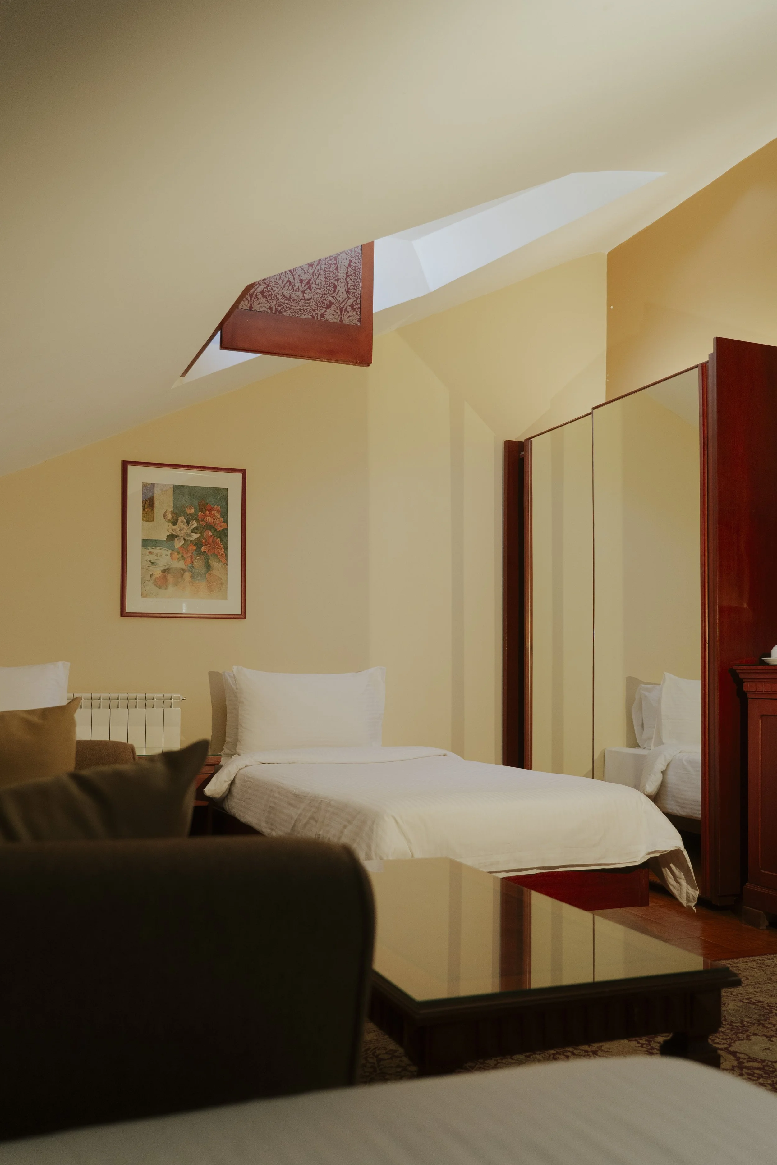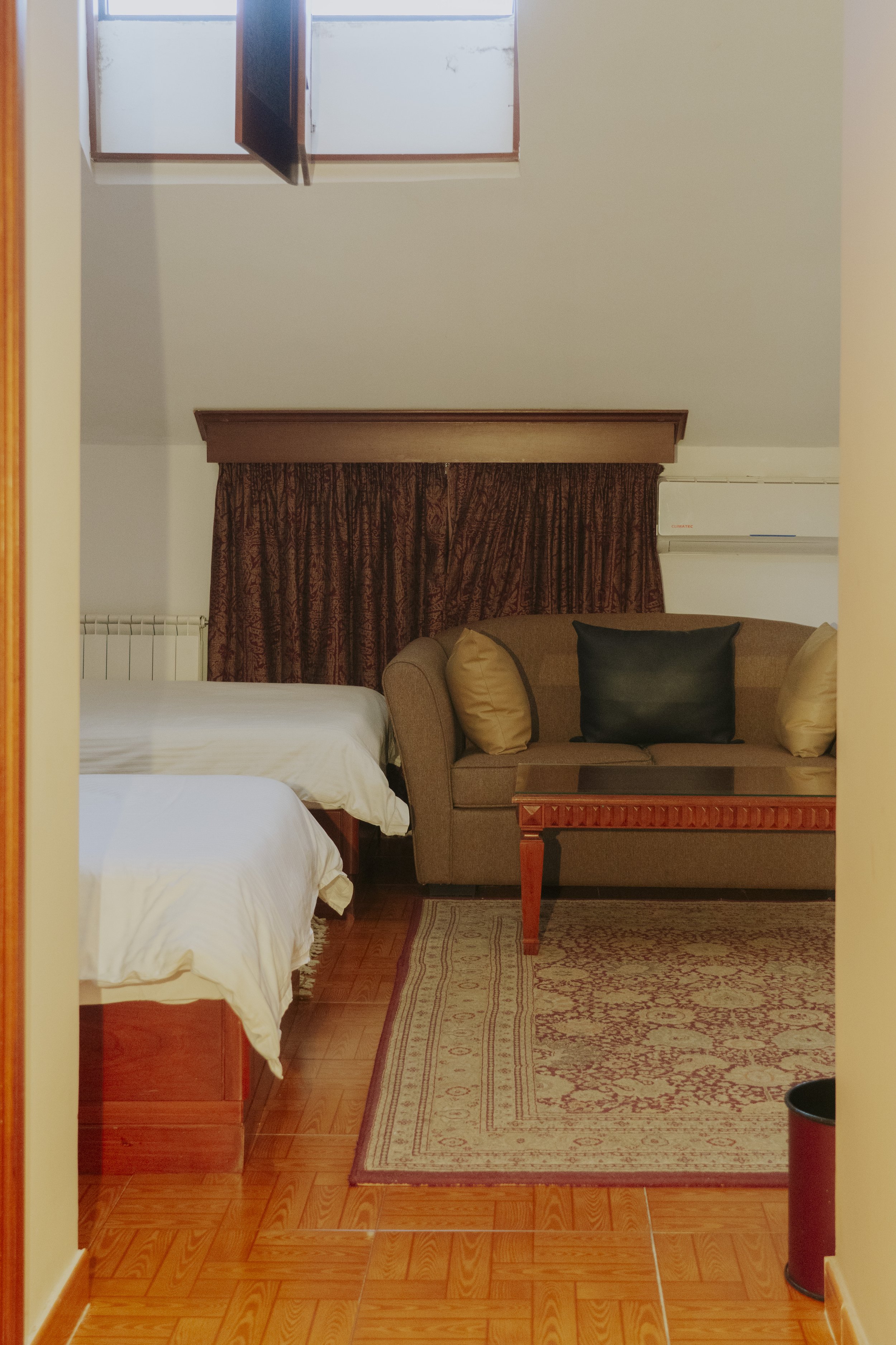 Discover our charming deluxe twin room with an inclined ceiling, twin beds for a comfortable night's sleep, and a cozy sofa couch, located on the top floor. Natural light enters through a small window, offering a glimpse of the serene surroundings. The modern standing shower adds convenience to your stay, making it the perfect space to refresh and relax.