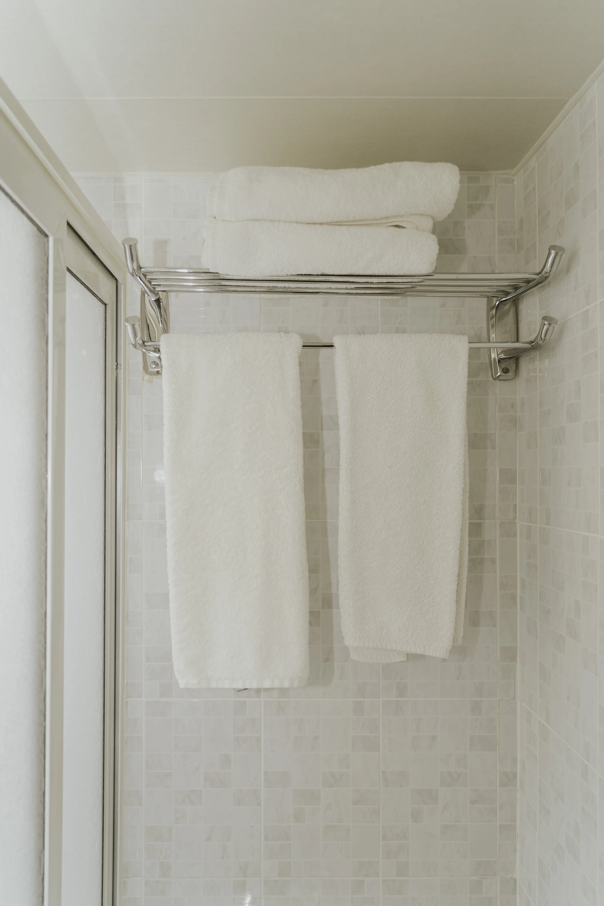 Discover our charming deluxe king room with an inclined ceiling, king beds for a comfortable night's sleep, and a cozy sofa couch, located on the top floor. Natural light enters through a small window, offering a glimpse of the serene surroundings. The modern standing shower adds convenience to your stay, making it the perfect space to refresh and relax.